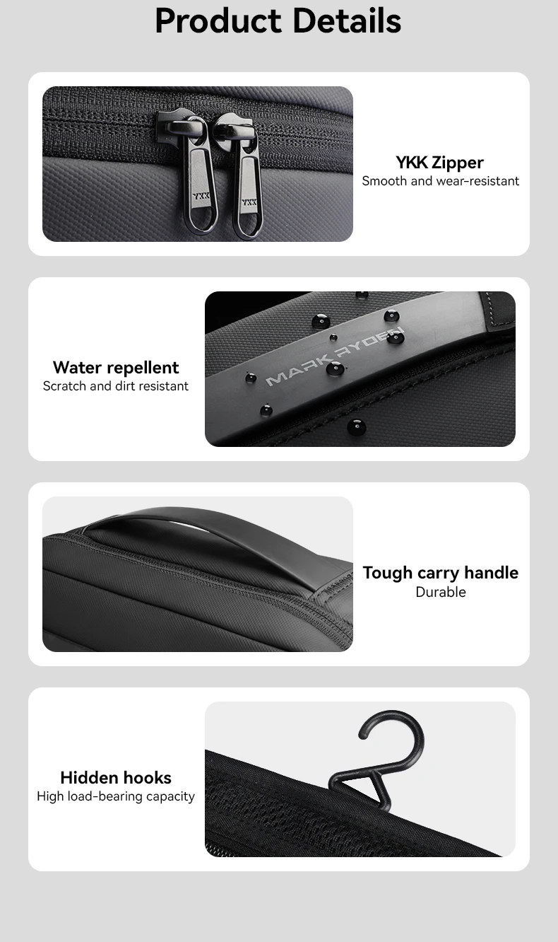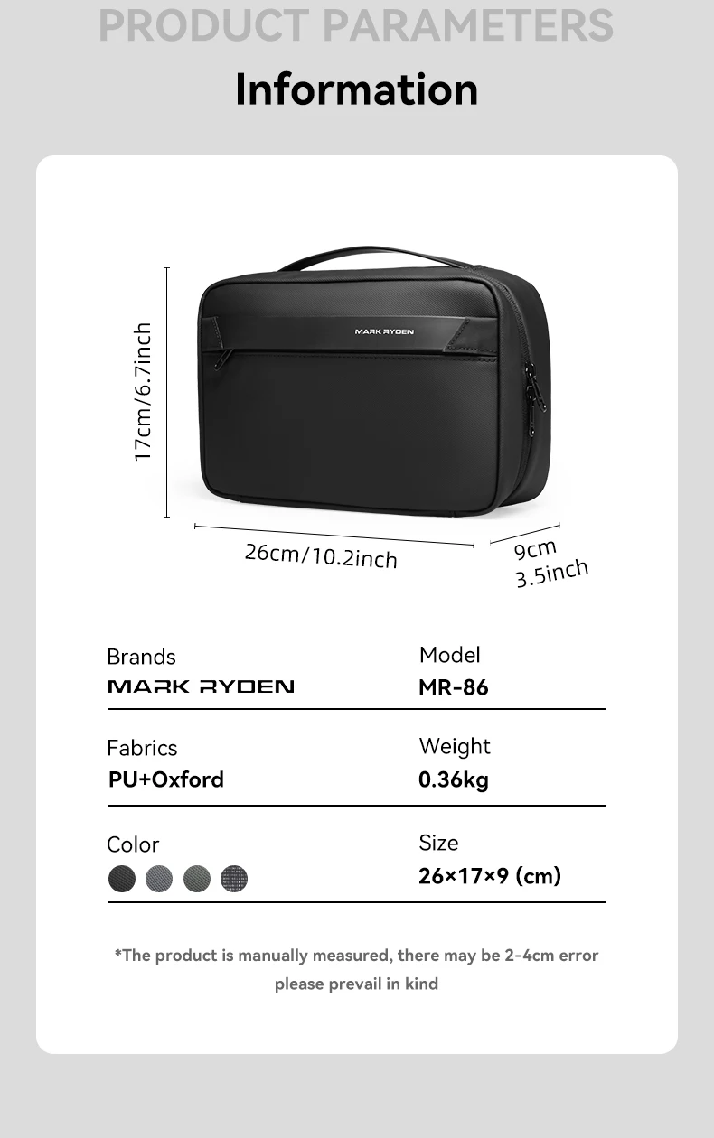 The Mark Ryden MR86 Compact Size Large Capacity Multi-Layer Paged Washbag is where style meets innovation in day-to-day travel essentials. Crafted for modern explorers, this sleek washbag combines elegance with superior functionality. Its compact design ensures easy portability, enabling you to travel light without compromising on the essentials. For those who value a polished look and flawless organization, the MR86 is a dependable companion.