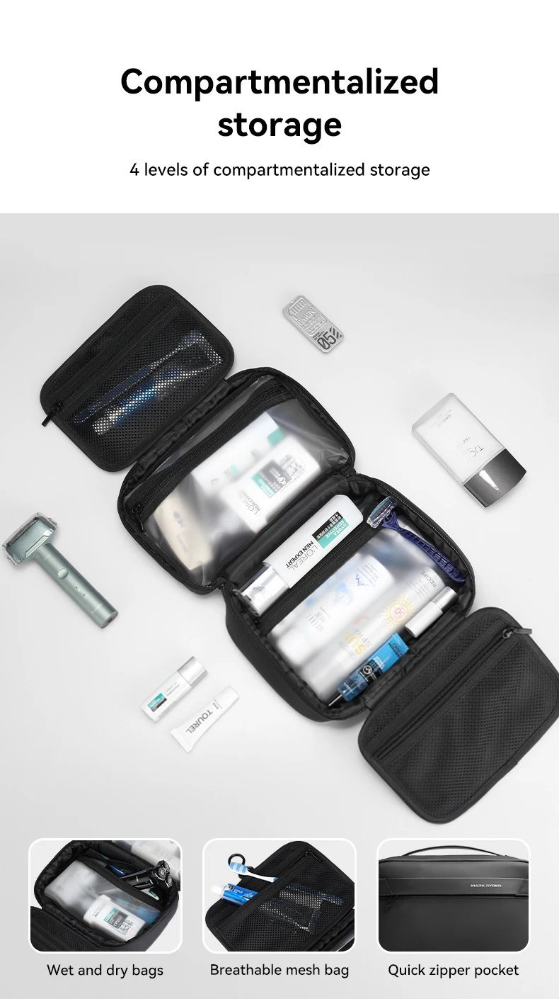 Gone are the days of rummaging through cluttered toiletry kits. The MR86 boasts a smart multi-layered structure that optimally utilizes every inch of its design. Separate compartments allow you to organize your toiletries effortlessly—keeping items like face wash, razors, and travel-sized bottles neatly arranged. With ample capacity packed into its compact frame, you can carry everything you need, whether for a quick weekend getaway or extended travel.